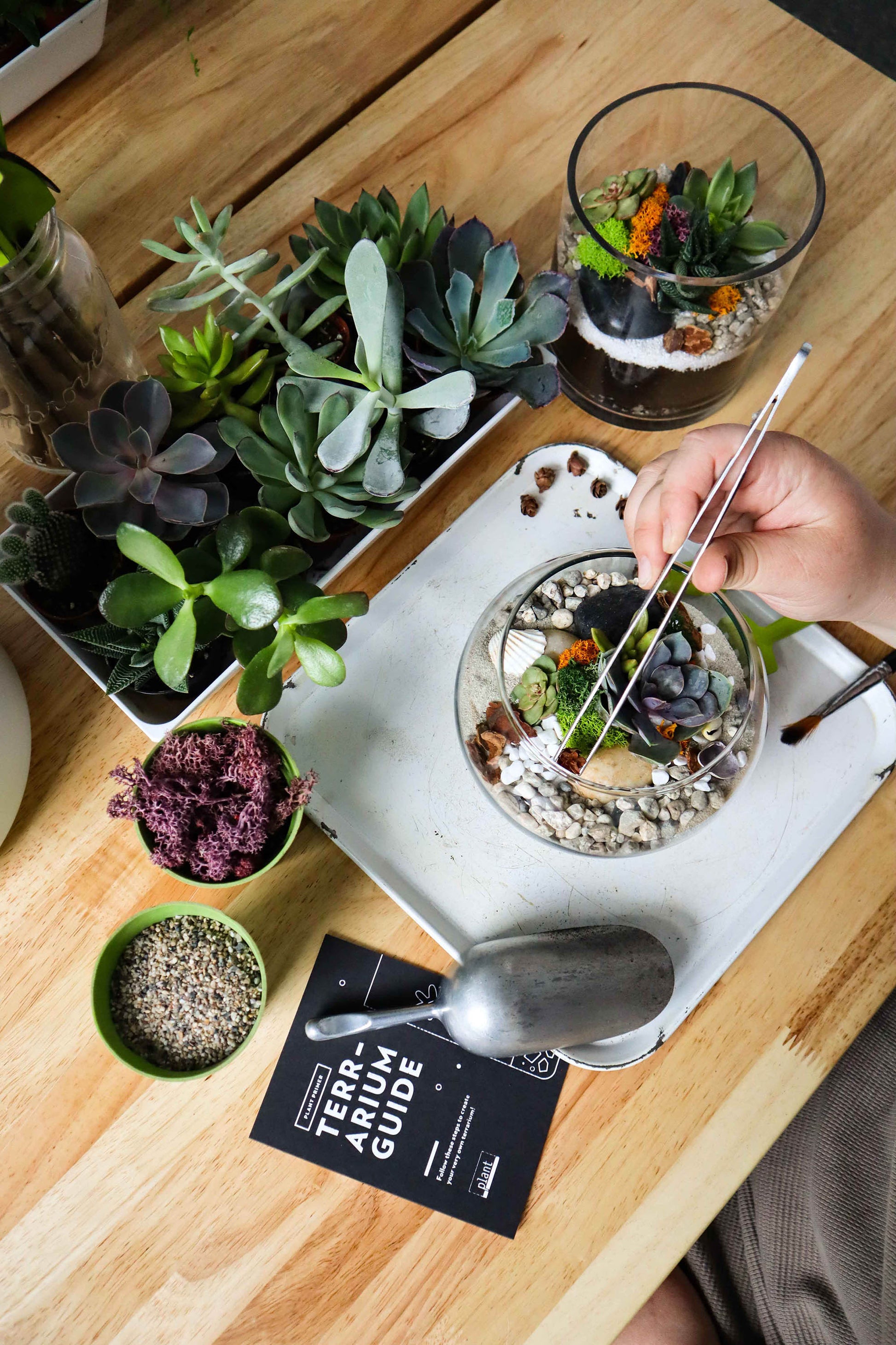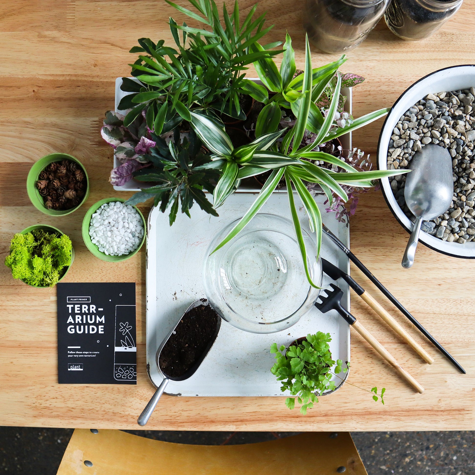 - All materials : glass container (approx. 6” in diameter), 2-3 plants (you’ll choose between succulents, cacti, or tropical plants), soil, decorative materials, terrarium information booklet, and care instructions