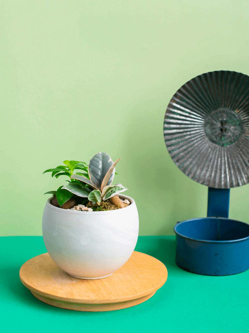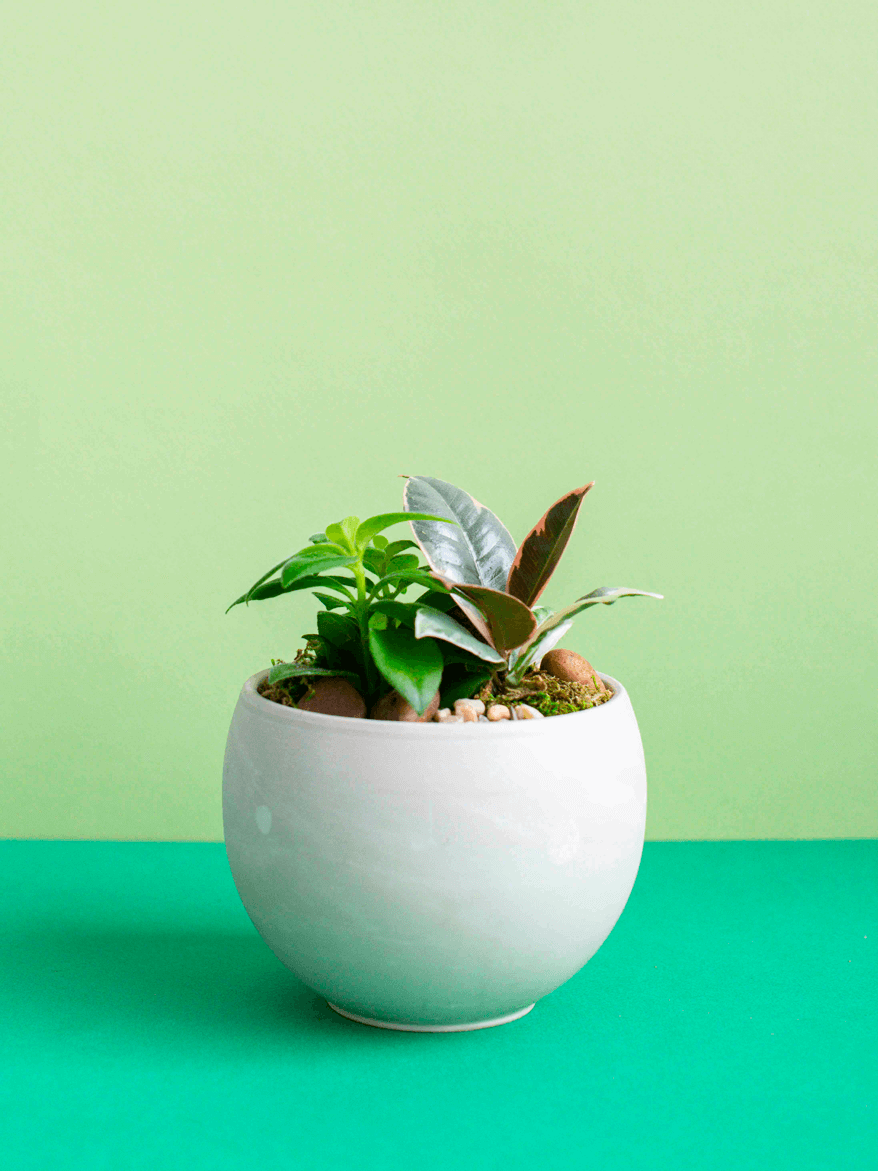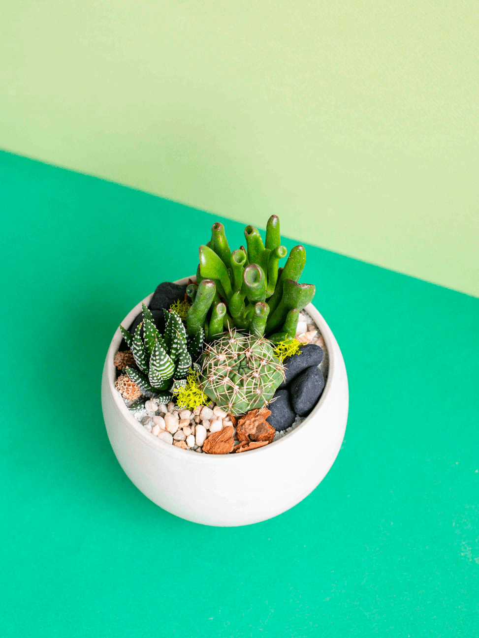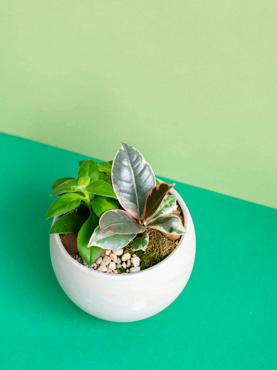 This lovely landscaped potted arrangement is set in a waterproof ceramic planter. It's neutral design will easily fit into any home and the lush combination of plants and decorative materials are sure to be a conversation piece.