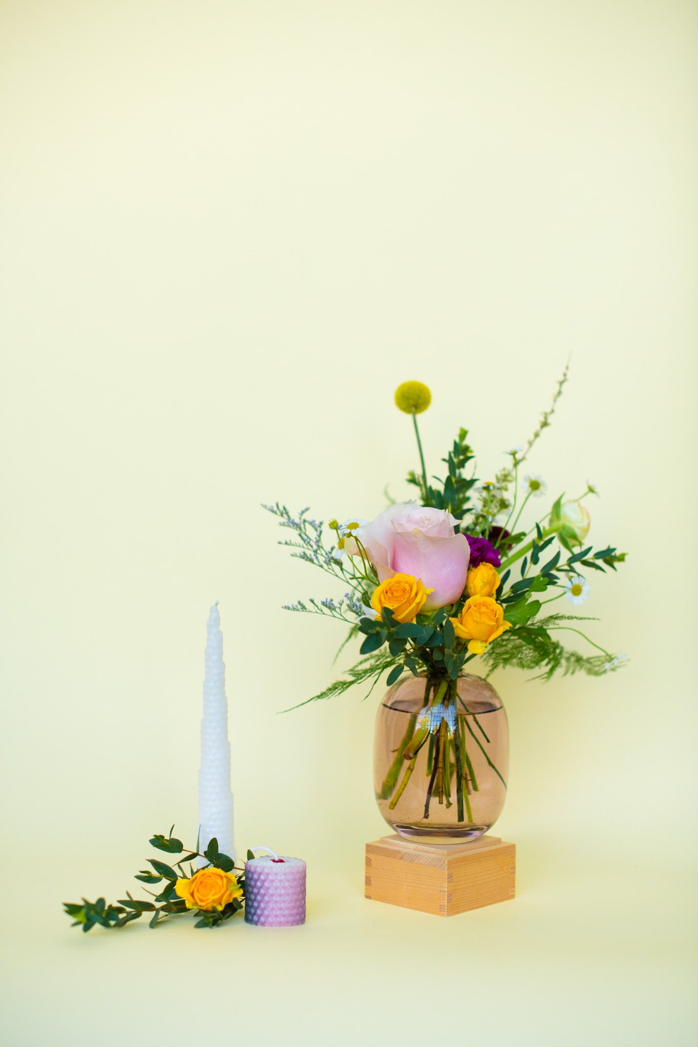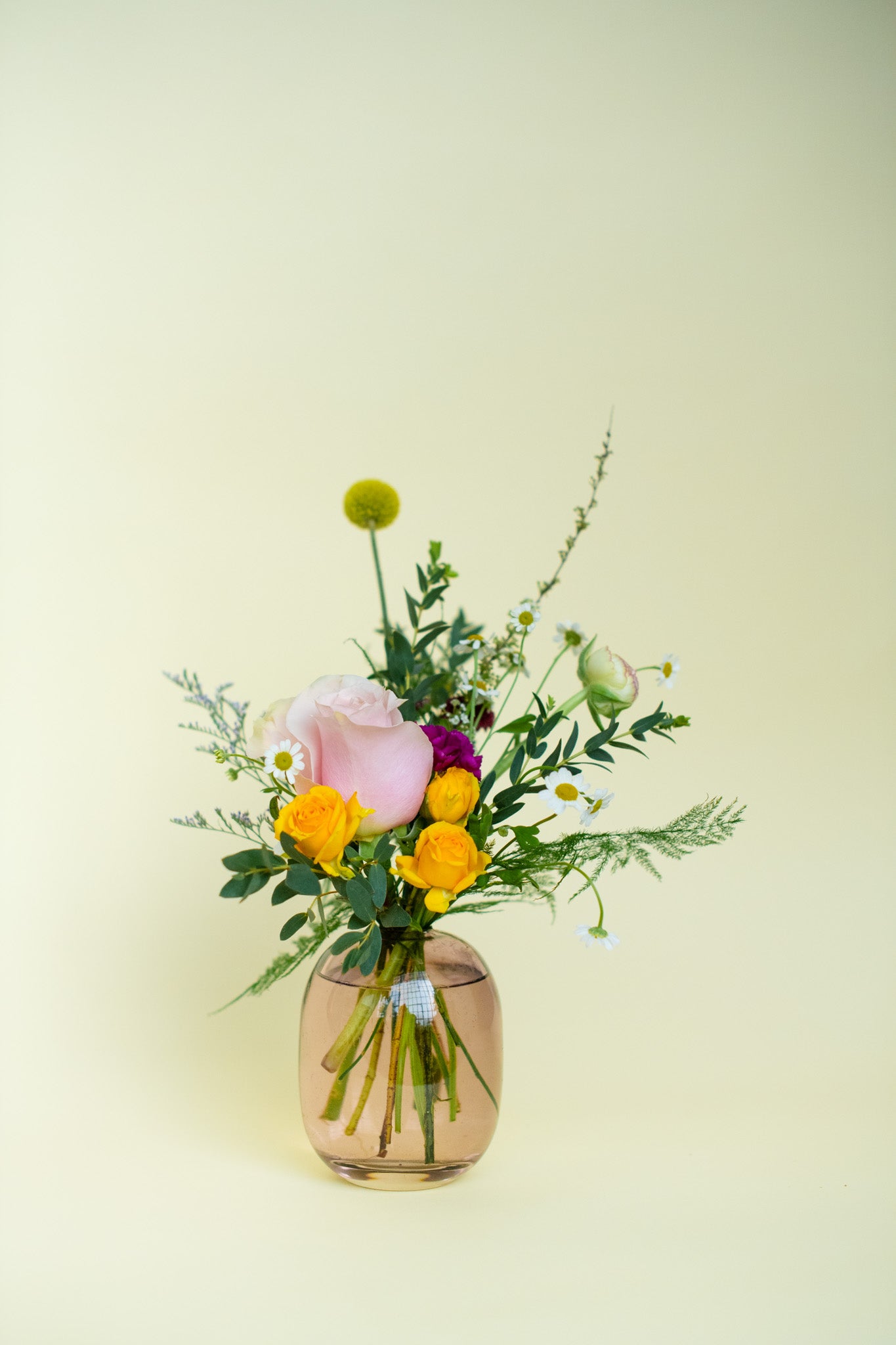 This beautiful classic floral Bud Vase is created with a mix of seasonal florals and greens, with a lush and organic aesthetic. Each arrangement comes in a oval shaped off pink tinted glass vase.
