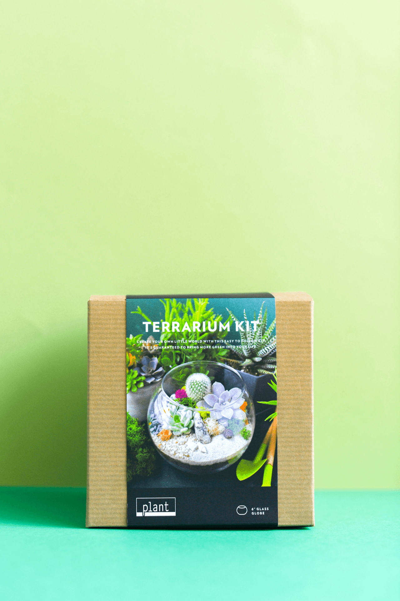 This kit includes: Our Terrarium Guide Book, 6" Glass Globe, Gravel, Activated Charcoal, Soil, Sand, River Rock, Decorative Materials, Reindeer Moss, & plants!